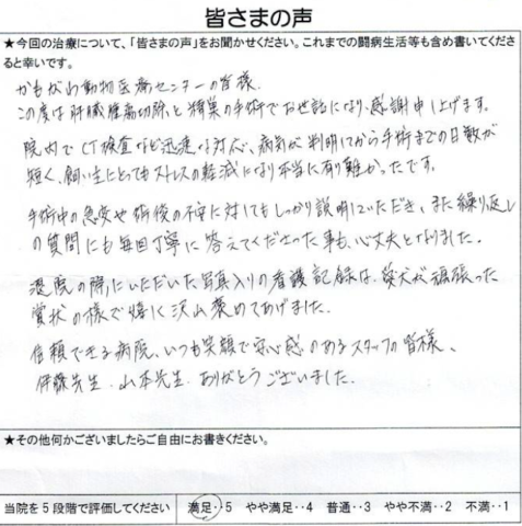 この度は肝臓腫瘍切除と精巣の手術でお世話になり、感謝申し上げます。