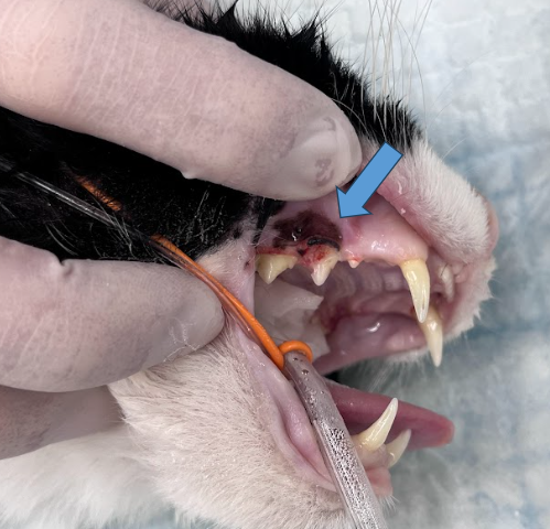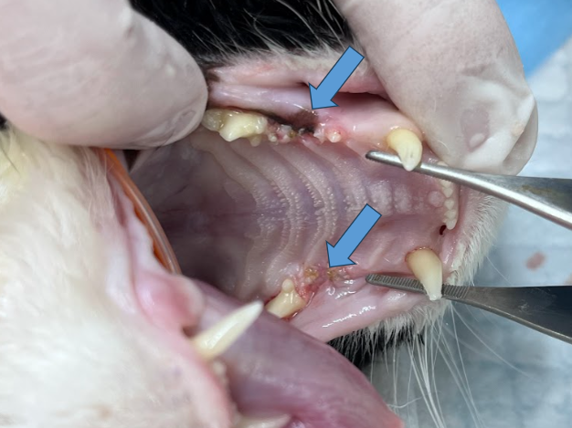 口腔内では歯石を除去した領域で破歯吸収病巣が認められ、抜歯と縫合を実施しました。