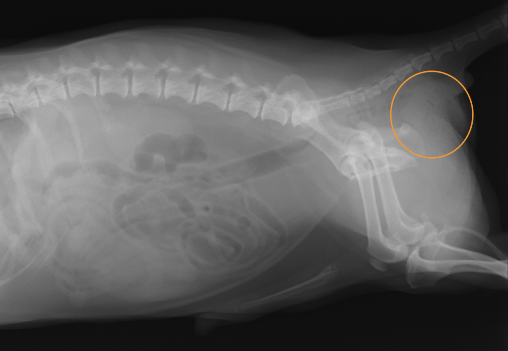 肛門の左側が大きく腫れており、直腸検査をすると直腸の左側に憩室ができておりそこに便が貯留しているのが触知できました。