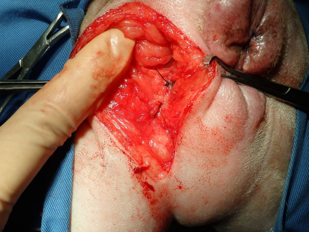 肛門の左側を切開すると、筋肉が薄くなり隙間が空いてできるヘルニア孔が見られました。