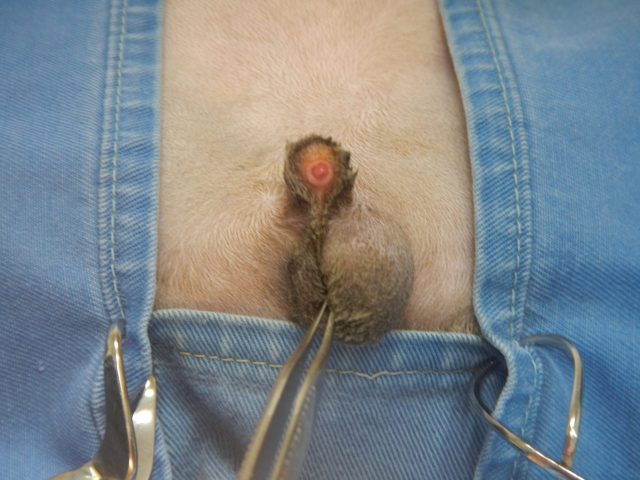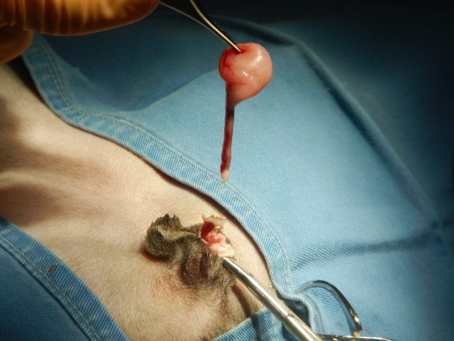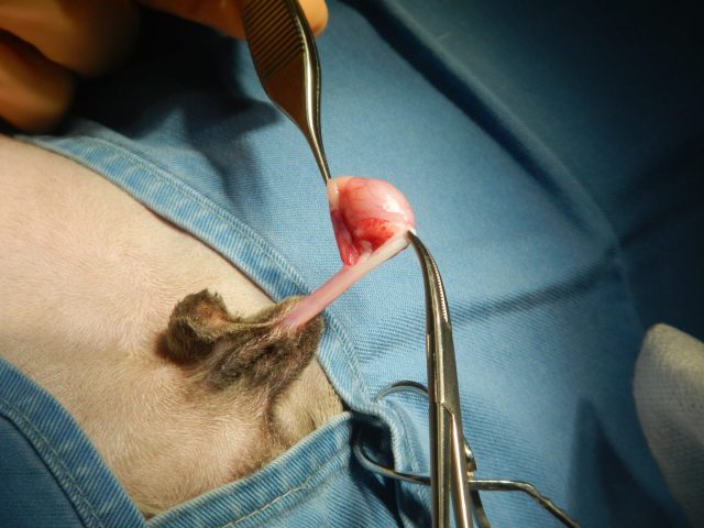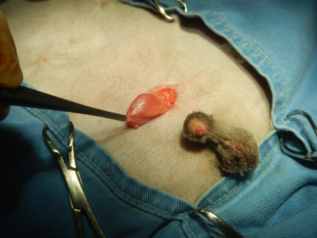 次に陰嚢手前の皮下にある右側の精巣の位置を確認し、皮膚を切開して摘出しました。