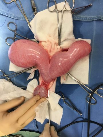そこでレントゲン検査、腹部超音波検査を実施したところ子宮内に液体成分の貯留が