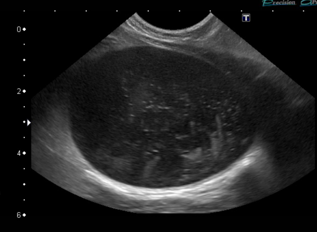 膀胱のエコー画像です。膀胱内に明らかな結石や腫瘍は見られませんが、膀胱内に細かい砂状構造物が多数見られます(白い点々)。