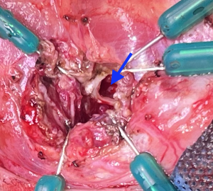 鼓室胞切開後の写真です。鼓室(青矢印)が広がっているのが分かります。