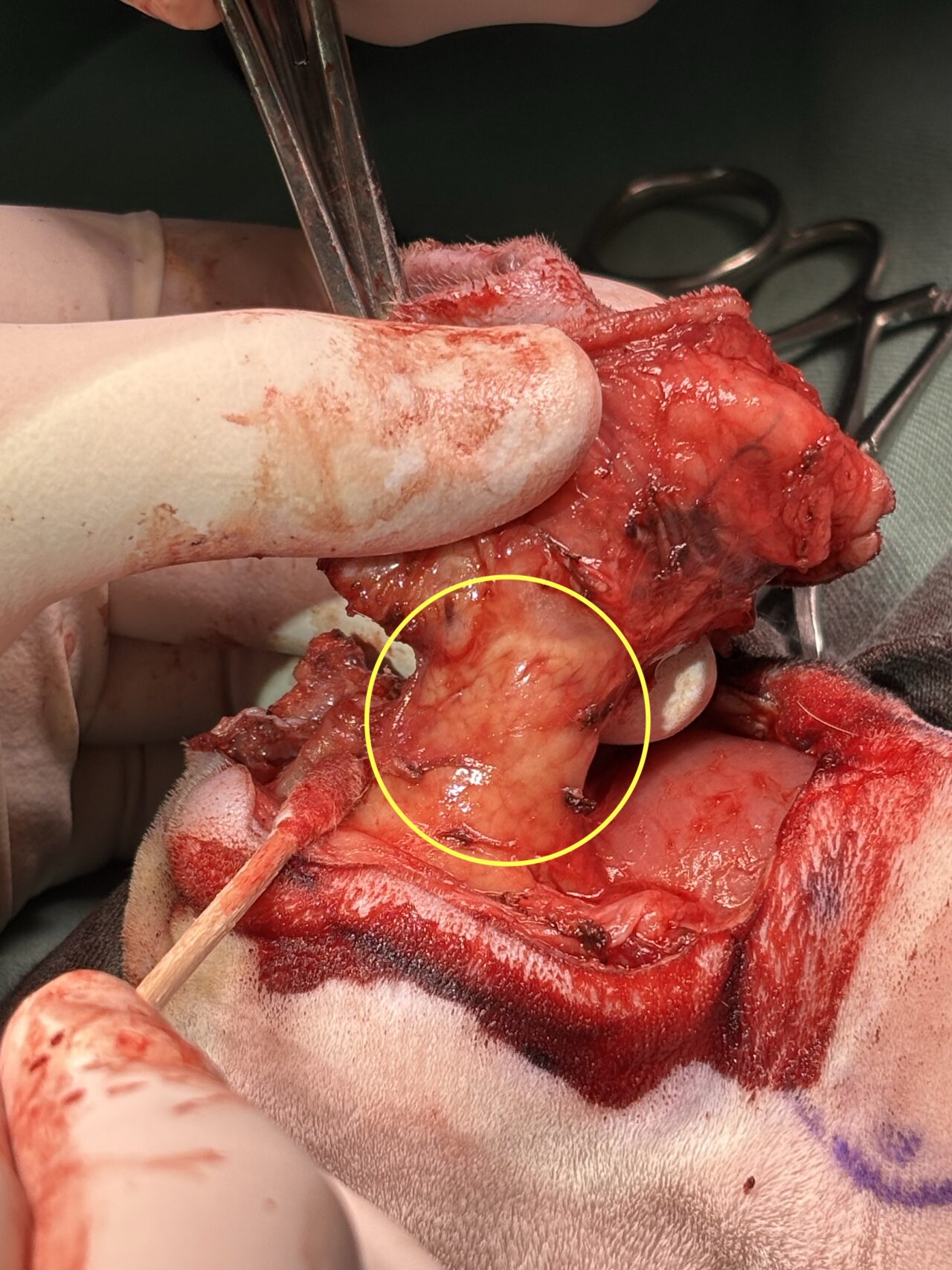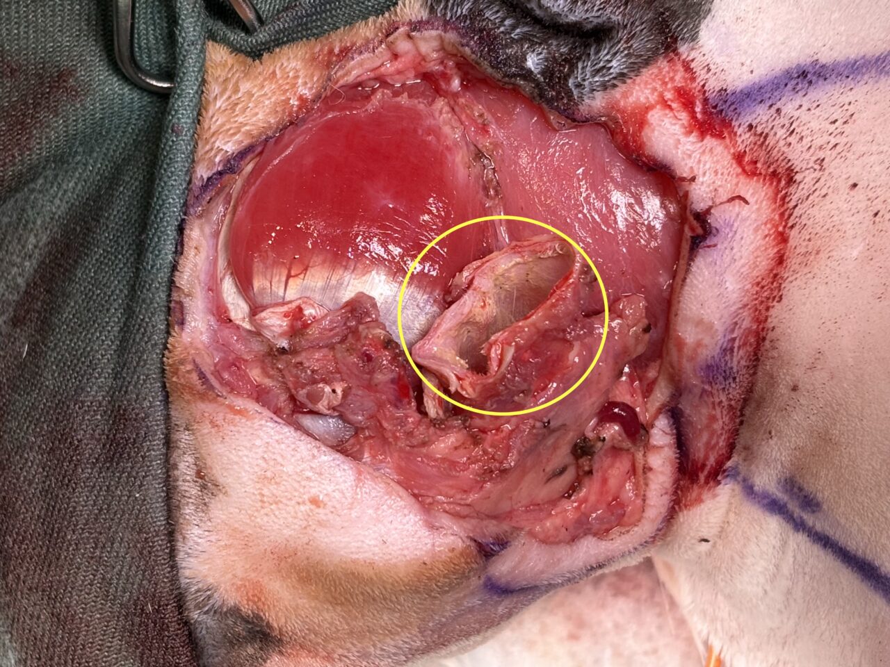 切除をすすめ、垂直耳道部分(黄色丸)を確認し、腫瘍が浸潤していないことを確認し、切除しました。