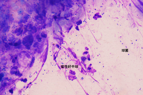 診断は病変部にスライドガラスを押し当て、染色し、顕微鏡で菌、好中球による菌の貪食(菌を取り込み処理する)、変性好中球(貪食後、形が変わる)を確認します。