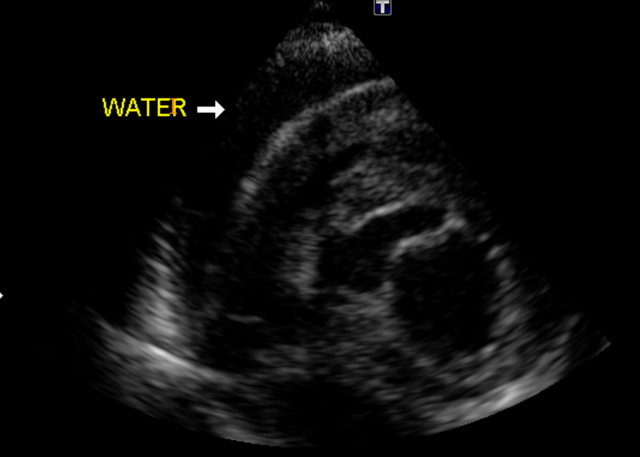 心臓エコー検査にて、心嚢水、右心房の虚脱を確認。また腫瘍や心臓病の確認もできます。