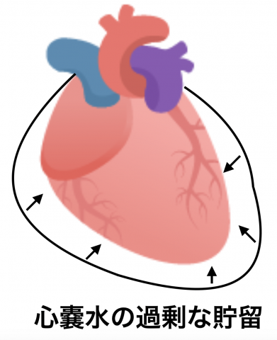 心タンポナーデとは、心膜腔内に出血あるいは心膜液が何らかの原因で貯留した結果、心膜腔内の圧が上昇し、右心房の圧を超えてしまった状態です。