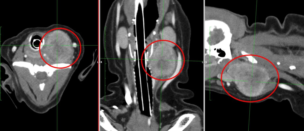 扁桃の扁平上皮癌と診断した15頭の報告では、明らかな転移がなく、根治治療(積極的治療)を行った場合の生存期間中央値は637日(168日〜1116日)であり、年単位の生存が可能です。