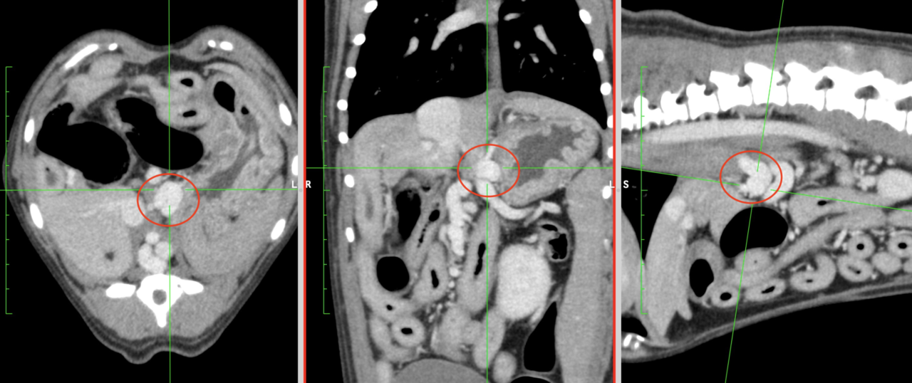 血液検査(アンモニアやTBAが高い)やレントゲン検査(肝臓が小さい)、尿検査(尿酸アンモニウム結晶がみられる)、超音波検査(肝臓が小さい、異常血管がみえる)で疑わしい場合、最終的にはCT検査で診断します。