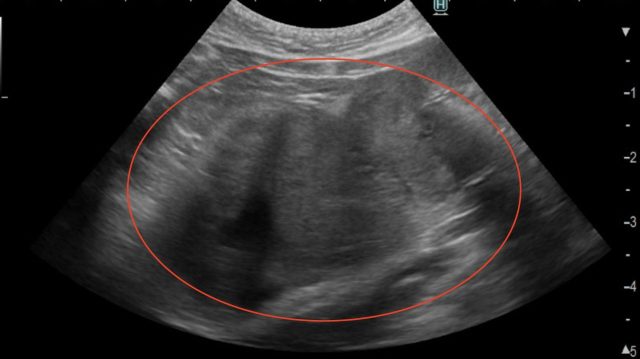 膵腺癌の超音波画像(赤丸)