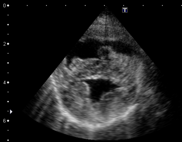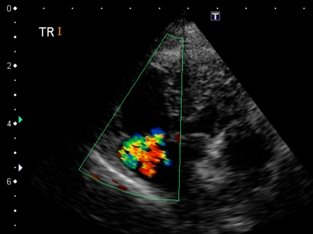 (モザイク状のカラーになっている部分が、三尖弁の逆流)
