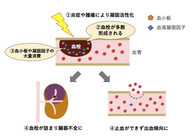 - 全身性の炎症や腫瘍などが引き金となって、血液の凝固が異常に活性化。
