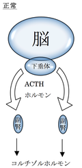 脳下垂体の腫瘍によって副腎皮質刺激ホルモン(ACTH)が持続的に過剰分泌され、両副腎が腫大し、コルチゾールが過剰に分泌されます。