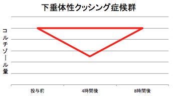 下垂体性クッシング症候群の場合、デキサメタゾンではネガティブフィードバックが起こらないので、血中コルチゾールの量は変わらないか、もしくは軽いネガティブフィードバックがかかり4時間後には血中コルチゾールが下がりますが、結局8時間後には上昇します。