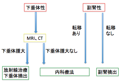 クッシング症候群には下垂体腫瘍性と副腎腫瘍性がありますが、これらは治療の方針が違います。