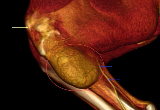 上記肉眼写真のCT画像(赤丸:軟部組織肉腫、青矢印:血管、黄色矢印:膝蓋骨)