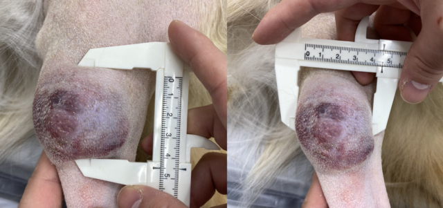 軟部組織肉腫は針生検(細い針をさして細胞を採取する検査)で診断可能なこともありますが、炎症との区別が難しかったり、針生検ではグレードの評価ができないため、状況に応じて組織生検(できものの一部を採取する検査)が必要となります。