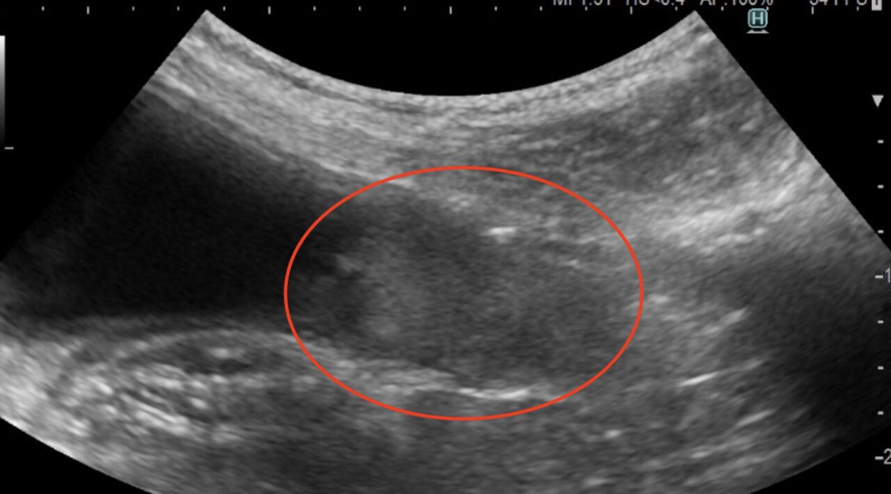 尿道の移行上皮癌の超音波画像(赤丸)